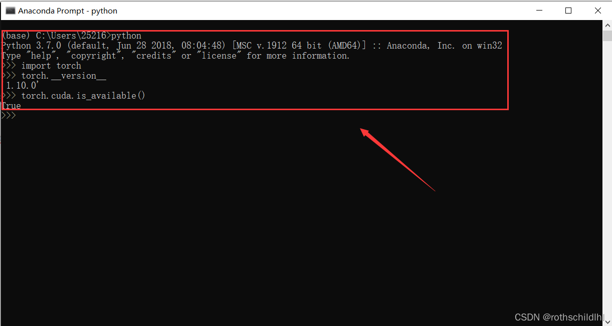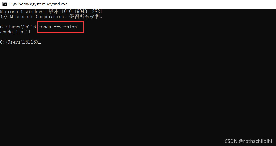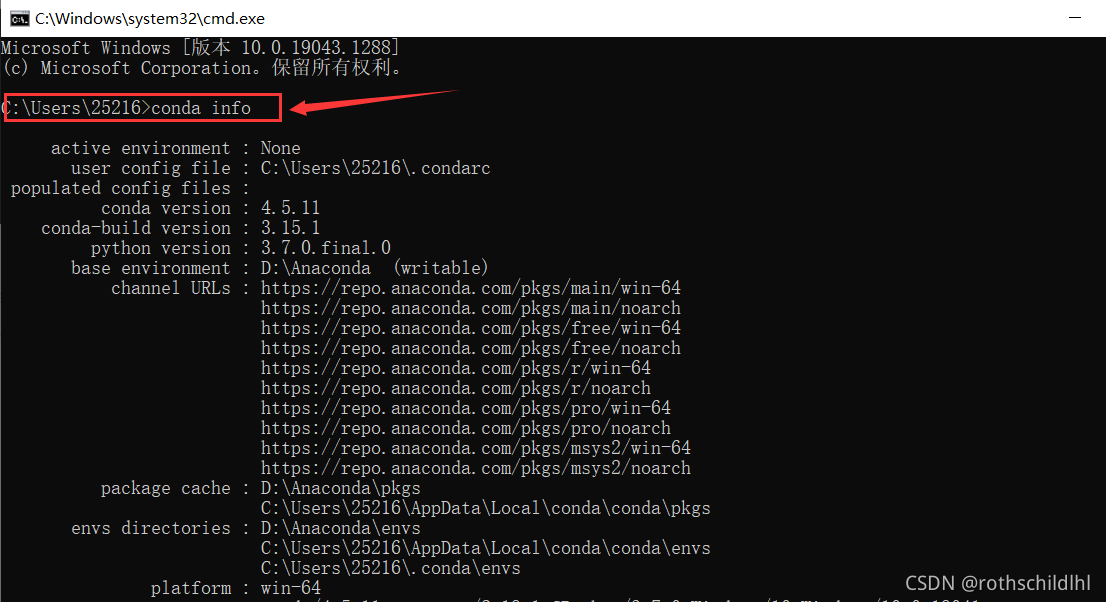 13、检验是否安装Anaconda成功,复制对应下面命令在CMD控制平台运行,若出现和博主图片一样的内容,说明安装成功。