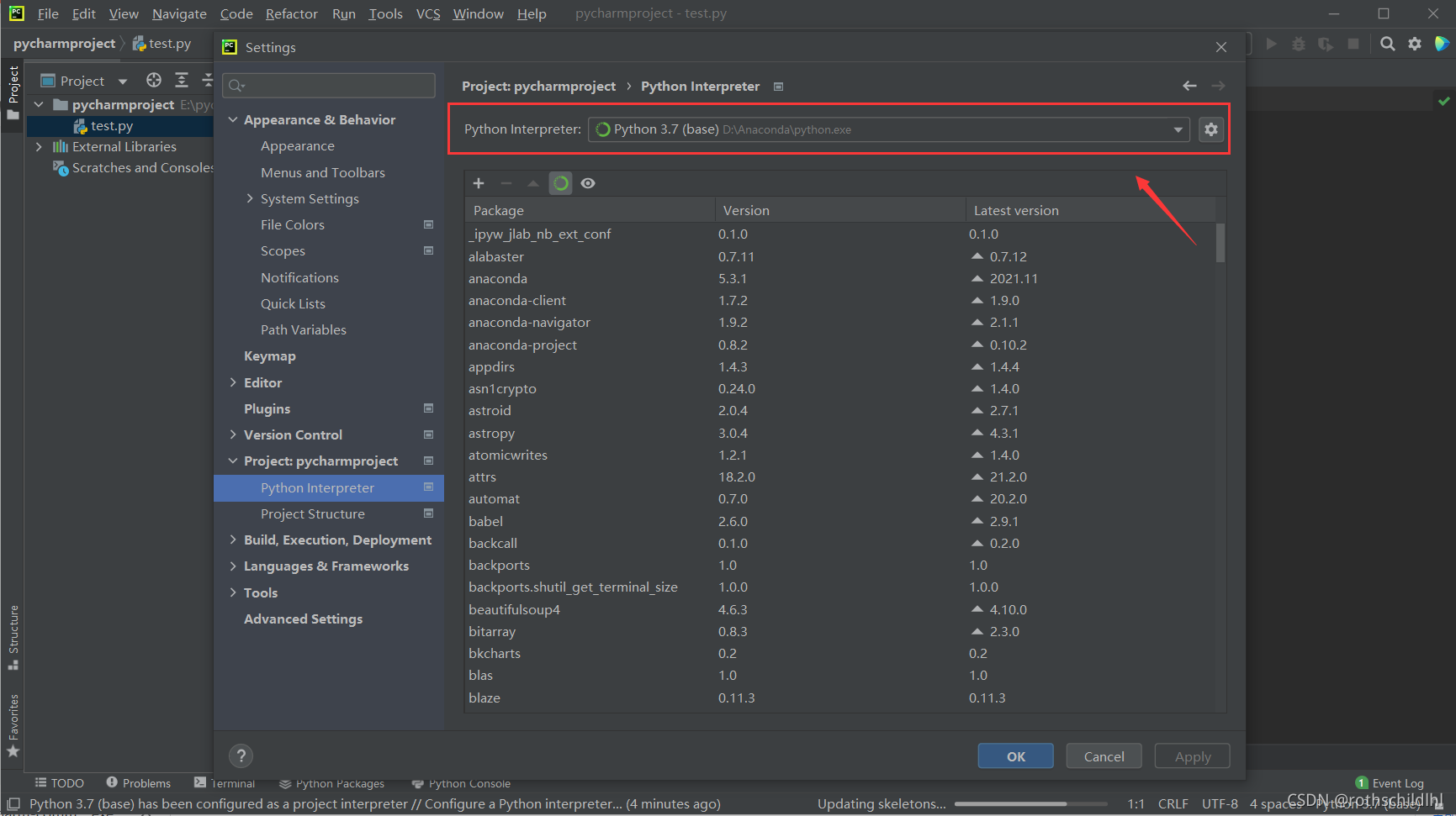 3、下载好Pycharm之后,其编译器选择之前已经安装的Anaconda下的Python编译器。
