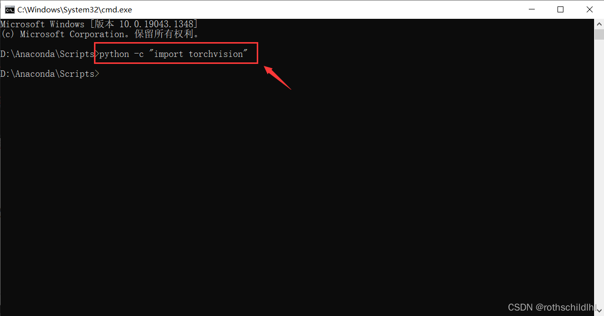 五、验证是否安装成功,输入下面的命令在CMD平台运行,没有报错说明安装导入包torchvision成功。