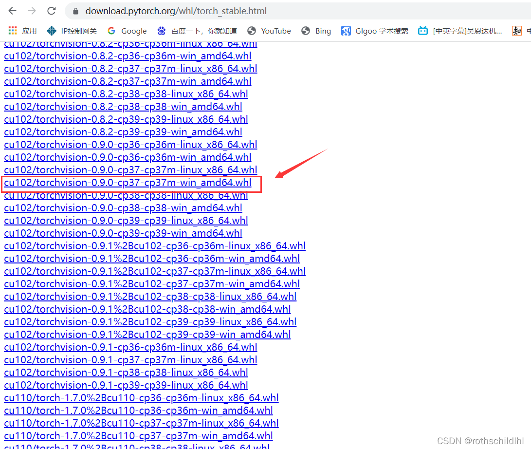 二、(重要)根据第一步的torch版本选择对应的链接,比如博主电脑已经下载好的torch版本是1.10.0,Cuda版本对应的是10.2,操作系统是Windows和Python的版本是3.7.0,所以选择对应的whl文件分别点击进行下载。(注意:cp37m对应3.7.0,win对应Windows,amd64对应64位)