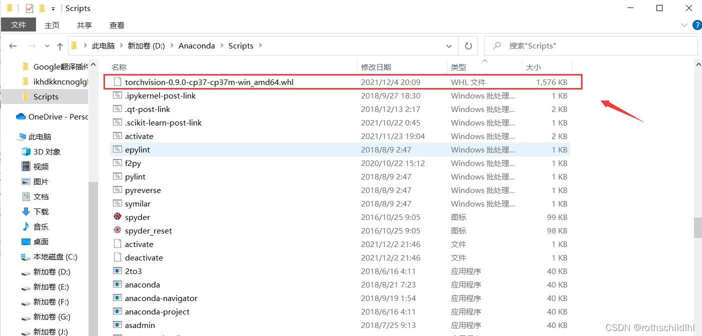 三、下载完成之后,将这些whl文件复制粘贴到Anaconda中的Scripts文件夹中,方便后面使用pip进行安装。