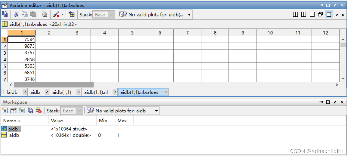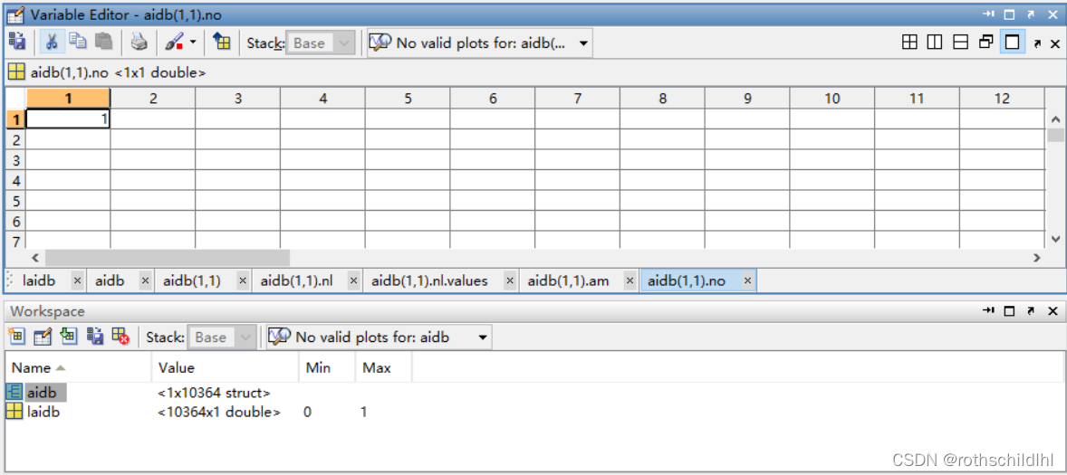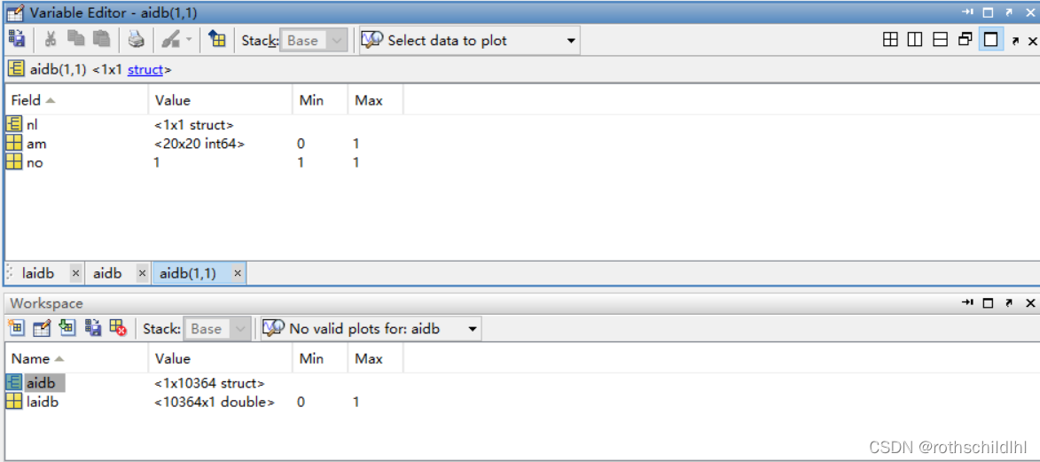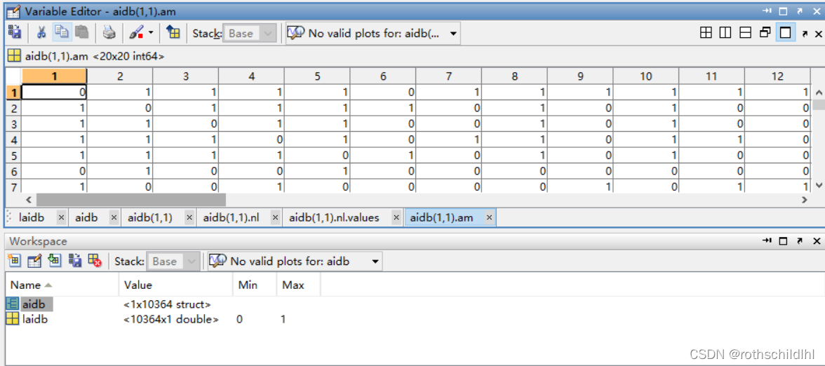 - aidb.mat文件数据结构如下图。aidb 是一个数据结构体(struct),包含10364个子结构体(struct),每个子结构体(struct)表示一张图,每张图又包含 nl、am 和 no;nl 表示节点及特征,维度是[20,1];am 表示节点之间的邻接矩阵,维度是[20,20];no 表示图片序号,维度是[1] 。laidb 表示所有图片的分类,结果是0或1,总共有10364张图,维度是[10364] ,注意:每张图的维度是[1] 。