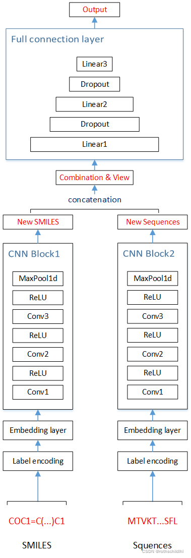 - Embedding layer 说明:将药物分子和蛋白质的数字序列进行词嵌入操作,也就是增加一维度表示,比如原来的维度是一维只有长度(药物分子初始设置为100,蛋白质初始设置为1000),增加宽度(宽度初始设置都为128)这一维度。注意:卷积后长度宽度初始设置会变化。
