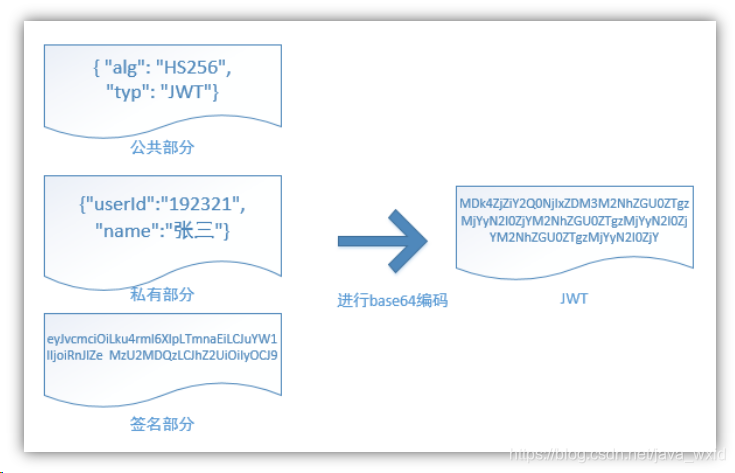一个JWT由三个部分组成:公共部分、私有部分、签名部分。最后由这三者组合进行base64编码得到JWT。