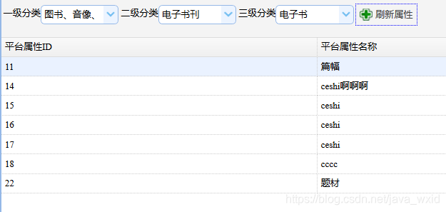 一级分类<select data-options="url:'getCatalog1',textField:'name',valueField:'id', onSelect: function(rec){ var url = 'getCatalog2?catalog1Id='+rec.id; $('#ctg2ForAttrList').combobox('clear'); $('#ctg2ForAttrList').combobox('reload', url); } " class="easyui-combobox" style="width: 100px"></select> 二级分类<select data-options="textField:'name',valueField:'id', onSelect: function(rec){ var url = 'getCatalog3?catalog2Id='+rec.id; $('#ctg3ForAttrList').combobox('clear'); $('#ctg3ForAttrList').combobox('reload', url); } " id="ctg2ForAttrList" class="easyui-combobox" style="width: 100px"></select> 三级分类<select data-options="textField:'name',valueField:'id'" id="ctg3ForAttrList" class="easyui-combobox" style="width: 100px"></select> <a href="javascript:reloadAttrList();" class="easyui-linkbutton" data-options="iconCls:'icon-add',plain:true">刷新属性</a>