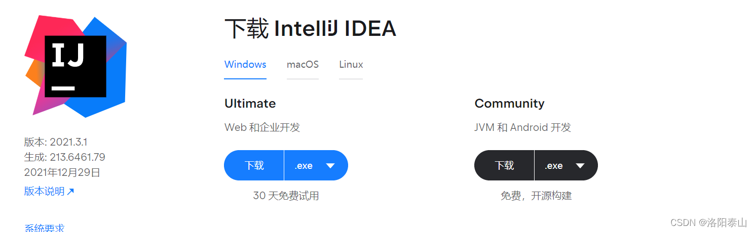 分为商业版和社区版,商业版功能强大可以免费试用30天,社区版免费,但是功能相对于商业版的少很多。选择一个版本进行下载, 安装。