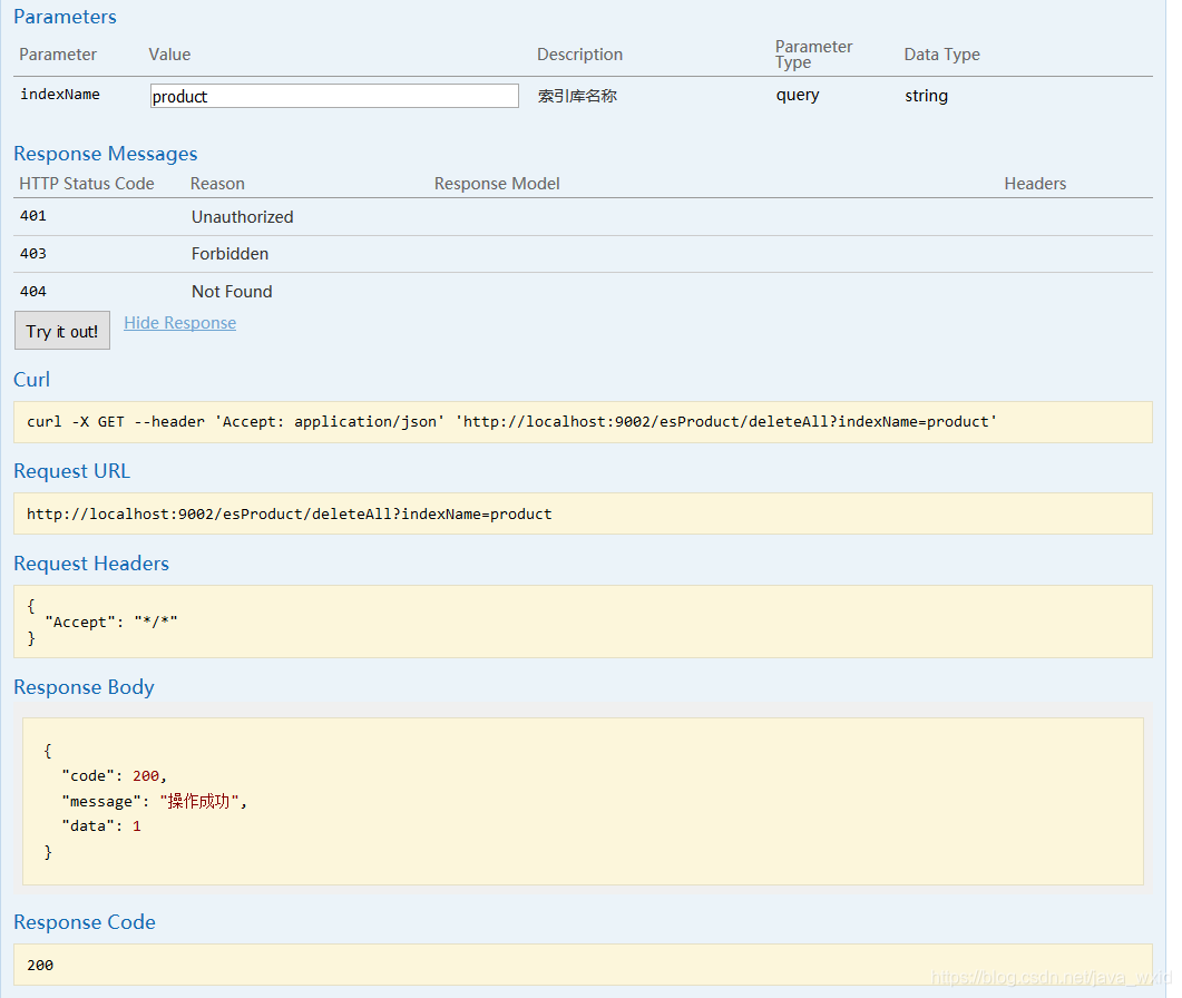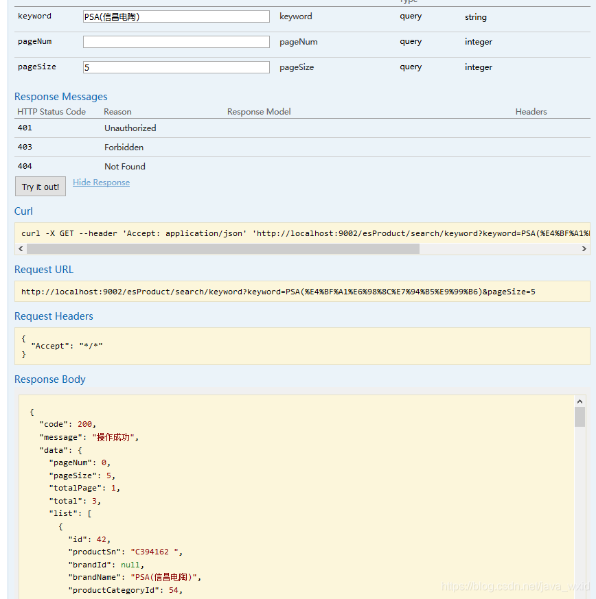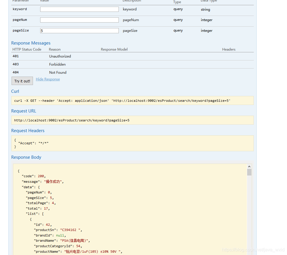 @Autowired private EsProductService esProductService; @ApiOperation(value = "简单搜索:根据关键字,品牌名称或者产品名称,产品编号,副标题搜索(字符串:Text类型最大拆分)") @RequestMapping(value = "/search/keyword", method = RequestMethod.GET) @ResponseBody public CommonResult<CommonPage<EsProduct>> searchKeyword(@RequestParam(required = false) String keyword, @RequestParam(required = false, defaultValue = "0") Integer pageNum, @RequestParam(required = false, defaultValue = "5") Integer pageSize) { Page<EsProduct> esProductPage = esProductService.searchKeyword(keyword, pageNum, pageSize); return CommonResult.success(CommonPage.restPage(esProductPage)); } @ApiOperation(value = "删除索引库") @ApiImplicitParam(name = "indexName", value = "索引库名称", defaultValue = "product", paramType = "query", dataType = "String") @RequestMapping(value = "/deleteAll", method = RequestMethod.GET) @ResponseBody public CommonResult<Object> deleteAll(String indexName) { int i = esProductService.deleteAll(indexName); return CommonResult.success(i); } @ApiOperation(value = "导入所有产品信息数据库中商品到ES") @RequestMapping(value = "/importAll", method = RequestMethod.GET) @ResponseBody public CommonResult<Integer> importAllList() { int count = esProductService.importAll(); return CommonResult.success(count); }