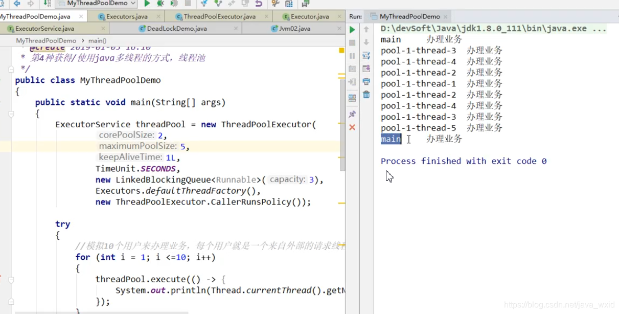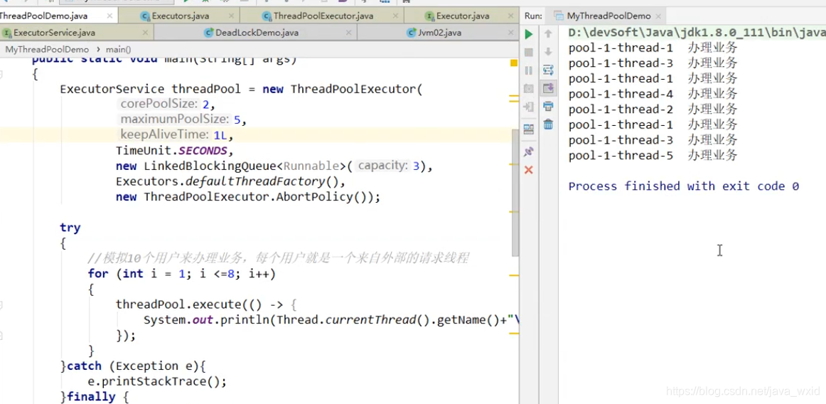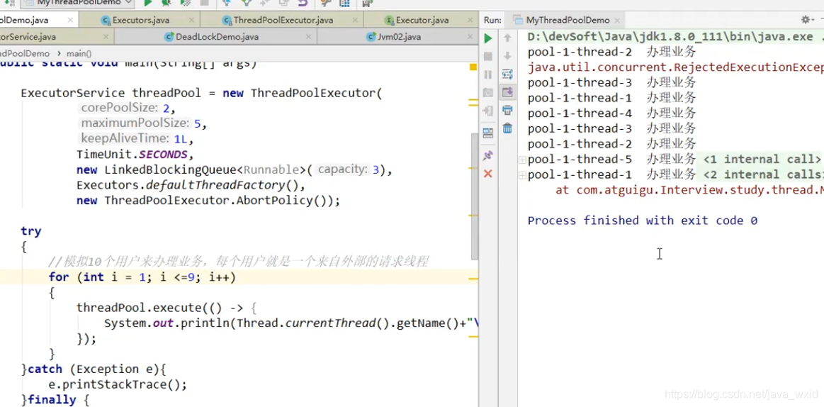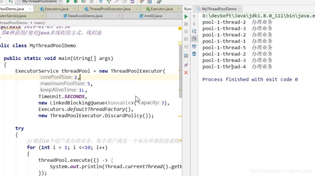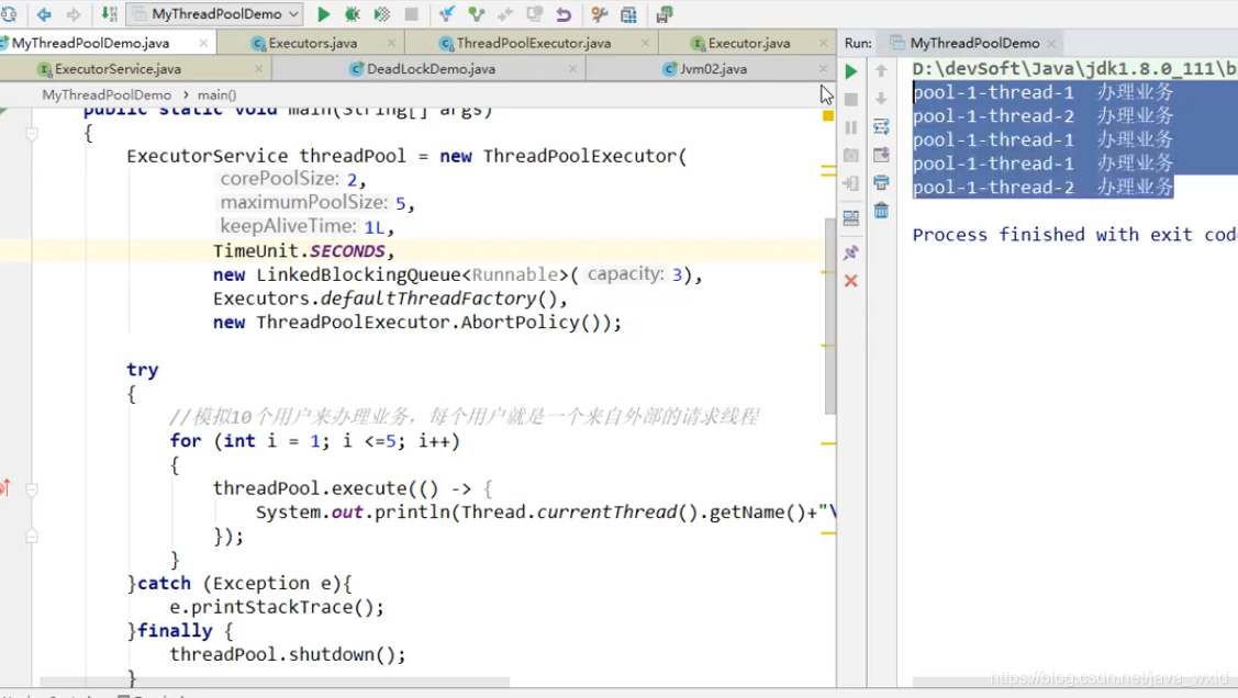 现在创建它:核心线程数2,同时执行的最大线程数5,多余线程存活时间1L,单位秒,阻塞队列3,默认线程工厂,拒绝策略
