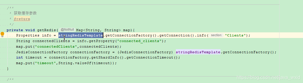 Properties info = stringRedisTemplate.getRequiredConnectionFactory().getConnection().info("memory"); 可选参数: server:有关Redis服务器的常规信息 clients:客户端连接部分 memory:内存消耗相关信息 persistence:RDB和AOF相关信息 stats:一般统计 replication:主/副本复制信息 cpu:CPU消耗统计信息 commandstats:Redis命令统计 cluster:“ Redis群集”部分 keyspace:与数据库相关的统计 它还可以采用以下值: all:返回所有部分 default:仅返回默认的部分集 如果未提供任何参数,则采用该default选项。 返回值: 复制代码 redis> INFO # Server # Redis服务器版本 redis_version:999.999.999 redis_git_sha1:3c968ff0 redis_git_dirty:0 redis_build_id:51089de051945df4 redis_mode:standalone # Redis 服务器的宿主操作系统 os:Linux 4.8.0-1-amd64 x86_64 # 架构(32 或 64 位) arch_bits:64 # Redis 所使用的事件处理机制 multiplexing_api:epoll atomicvar_api:atomic-builtin # 编译 Redis 时所使用的 GCC 版本 gcc_version:6.3.0 # 服务器进程的 PID process_id:9941 # Redis 服务器的随机标识符(用于 Sentinel 和集群) run_id:b770a8af038963f3d1b55358c2e376d0b5e00182 # TCP/IP 监听端口 tcp_port:6379 # 自 Redis 服务器启动以来,经过的秒数 uptime_in_seconds:1028993 # 自 Redis 服务器启动以来,经过的天数 uptime_in_days:11 hz:10 # 以分钟为单位进行自增的时钟,用于 LRU 管理 lru_clock:10750613 executable:/usr/local/bin/redis-server config_file: # Clients # 已连接客户端的数量(不包括通过从属服务器连接的客户端) connected_clients:4 # 当前连接的客户端当中,最长的输出列表 client_longest_output_list:0 # 当前连接的客户端当中,最大输入缓存 client_biggest_input_buf:0 # 正在等待阻塞命令(BLPOP、BRPOP、BRPOPLPUSH)的客户端的数量 blocked_clients:0 # Memory # 由 Redis 分配器分配的内存总量,以字节(byte)为单位 used_memory:154272800 # 以人类可读的格式返回 Redis 分配的内存总量 used_memory_human:147.13M # 从操作系统的角度,返回 Redis 已分配的内存总量(俗称常驻集大小)。这个值和 top 、 ps等命令的输出一致。 used_memory_rss:160612352 # 以人类可读的格式返回 used_memory_rss_human:153.17M # Redis 的内存消耗峰值(以字节为单位) used_memory_peak:154319968 # 以人类可读的格式返回 Redis 的内存消耗峰值 used_memory_peak_human:147.17M # 使用内存达到峰值内存的百分比,即(used_memory/ used_memory_peak) *100% used_memory_peak_perc:99.97% # Redis为了维护数据集的内部机制所需的内存开销,包括所有客户端输出缓冲区、查询缓冲区、AOF重写缓冲区和主从复制的backlog used_memory_overhead:44082040 # Redis服务器启动时消耗的内存 used_memory_startup:510704 # 数据占用的内存大小,即used_memory-used_memory_overhead used_memory_dataset:110190760 # 数据占用的内存大小的百分比,100%*(used_memory_dataset/(used_memory-used_memory_startup)) used_memory_dataset_perc:71.66% allocator_allocated:154256264 allocator_active:154550272 allocator_resident:159731712 # 整个系统内存 total_system_memory:1044770816 # 以更直观的格式显示整个系统内存 total_system_memory_human:996.37M # Lua脚本存储占用的内存 used_memory_lua:37888 # 以更直观的格式显示Lua脚本存储占用的内存 used_memory_lua_human:37.00K # Redis实例的最大内存配置 maxmemory:0 # 以更直观的格式显示Redis实例的最大内存配置 maxmemory_human:0B # 当达到maxmemory时的淘汰策略 maxmemory_policy:noeviction allocator_frag_ratio:1.00 allocator_frag_bytes:294008 allocator_rss_ratio:1.03 allocator_rss_bytes:5181440 rss_overhead_ratio:1.01 rss_overhead_bytes:880640 # 碎片率,used_memory_rss/ used_memory mem_fragmentation_ratio:1.04 mem_fragmentation_bytes:6422528 # 在编译时指定的, Redis 所使用的内存分配器。可以是 libc 、 jemalloc 或者 tcmalloc 。 mem_allocator:jemalloc-4.0.3 active_defrag_running:0 lazyfree_pending_objects:0 # Persistence,RDB 持久化和 AOF 持久化有关信息 # 一个标志值,记录了服务器是否正在载入持久化文件 loading:0 # 距离最近一次成功创建持久化文件之后,经过了多少秒 rdb_changes_since_last_save:3813014 # 一个标志值,记录了服务器是否正在创建 RDB 文件 rdb_bgsave_in_progress:0 # 最近一次成功创建 RDB 文件的 UNIX 时间戳 rdb_last_save_time:1570002708 # 一个标志值,记录了最近一次创建 RDB 文件的结果是成功还是失败 rdb_last_bgsave_status:ok # 记录了最近一次创建 RDB 文件耗费的秒数 rdb_last_bgsave_time_sec:-1 # 如果服务器正在创建 RDB 文件,那么这个域记录的就是当前的创建操作已经耗费的秒数 rdb_current_bgsave_time_sec:-1 rdb_last_cow_size:0 # 一个标志值,记录了 AOF 是否处于打开状态 aof_enabled:0 # 一个标志值,记录了服务器是否正在创建 AOF 文件 aof_rewrite_in_progress:0 # 一个标志值,记录了在 RDB 文件创建完毕之后,是否需要执行预约的 AOF 重写操作 aof_rewrite_scheduled:0 # 最近一次创建 AOF 文件耗费的时长 aof_last_rewrite_time_sec:-1 # 如果服务器正在创建 AOF 文件,那么这个域记录的就是当前的创建操作已经耗费的秒数 aof_current_rewrite_time_sec:-1 # 一个标志值,记录了最近一次创建 AOF 文件的结果是成功还是失败 aof_last_bgrewrite_status:ok aof_last_write_status:ok aof_last_cow_size:0 # Stats,一般统计信息 # 服务器已接受的连接请求数量 total_connections_received:96 # 服务器已执行的命令数量 total_commands_processed:8700000 # 服务器每秒钟执行的命令数量 instantaneous_ops_per_sec:11 total_net_input_bytes:710523330 total_net_output_bytes:109073206 instantaneous_input_kbps:1.04 instantaneous_output_kbps:0.32 rejected_connections:0 sync_full:0 sync_partial_ok:0 sync_partial_err:0 # 因为过期而被自动删除的数