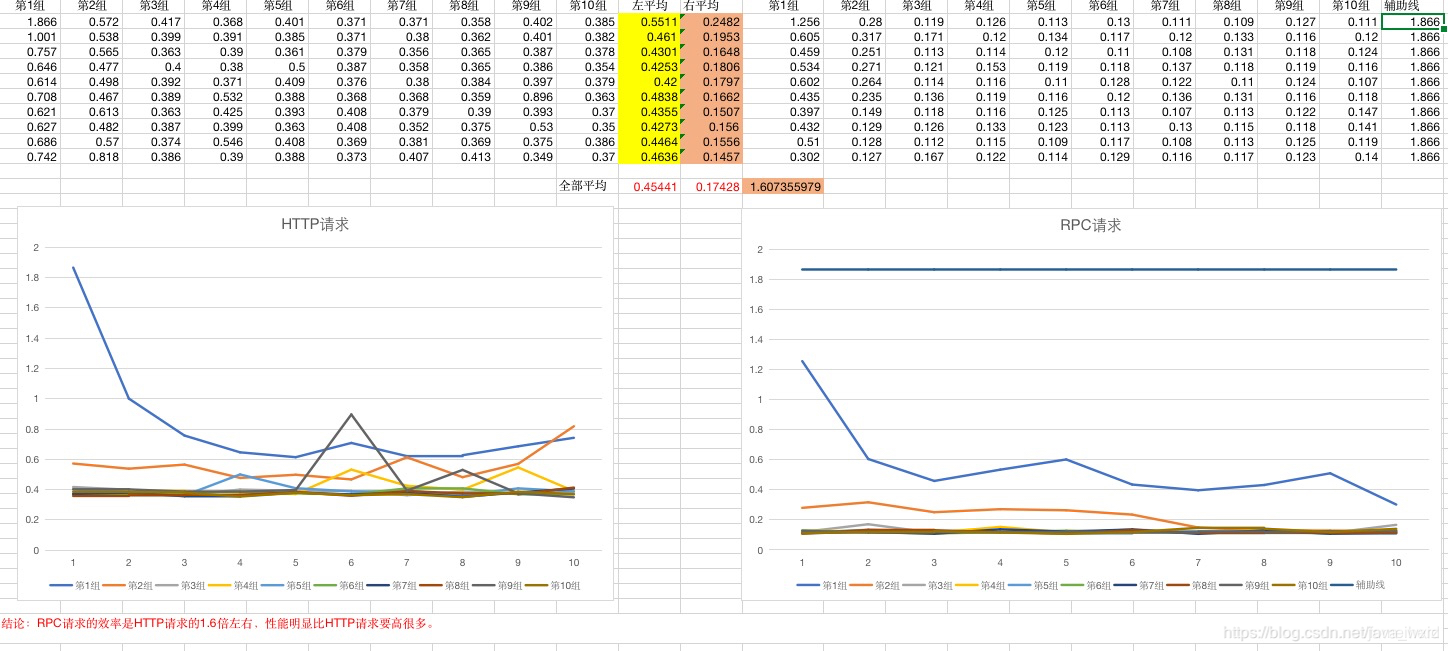 结论:RPC请求的效率是HTTP请求的1.6倍左右,性能明显比HTTP请求要高很多,因为HTTP协议包含大量的请求头、响应头信息。