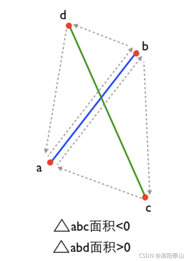 如果"线段ab和点c构成的三角形面积"与"线段ab和点d构成的三角形面积" 构成的三角形面积的正负符号相异,