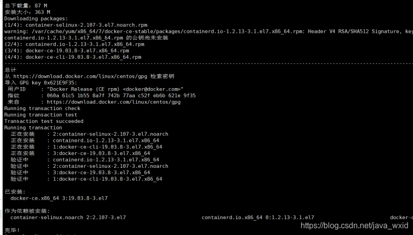 安装需要的软件包, yum-util 提供yum-config-manager功能,另外两个是devicemapper驱动依赖的,安装成功如下图所示