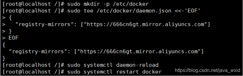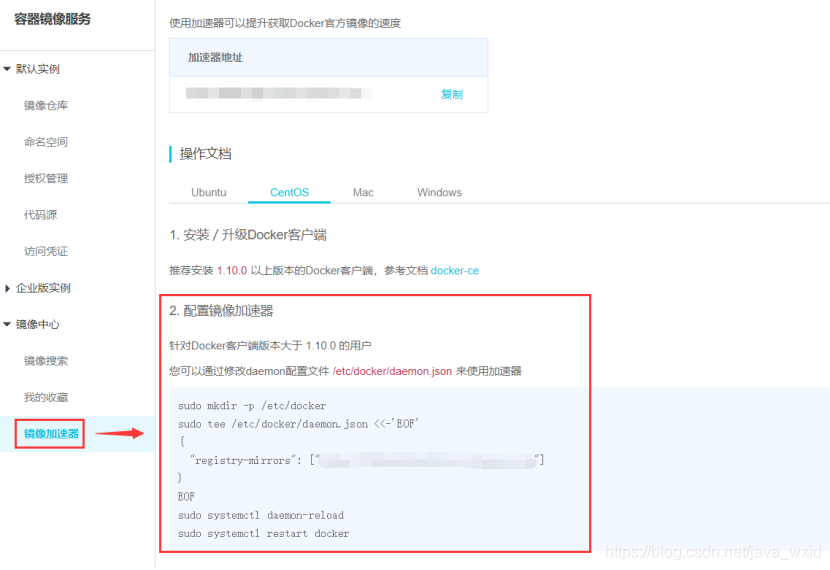 配置阿里云镜像加速器.注册登录阿里云官网,搜索容器镜像服务.点击进去看到以下界面.点击镜像加速器.复制该段命令一一执行.(每个账号的阿里云加速地址都不一样.所以需要登录自己账号复制命令,sudo为使用管理员权限操作命令成功如图二)