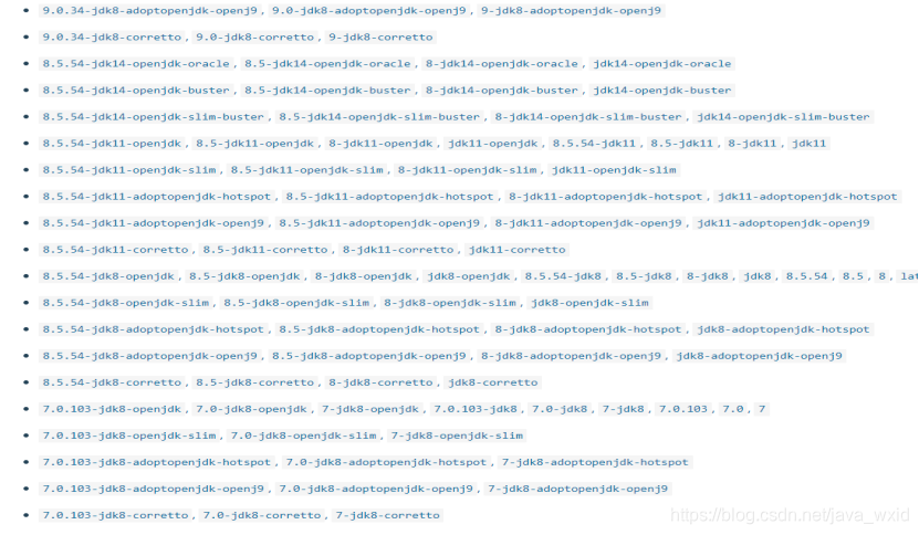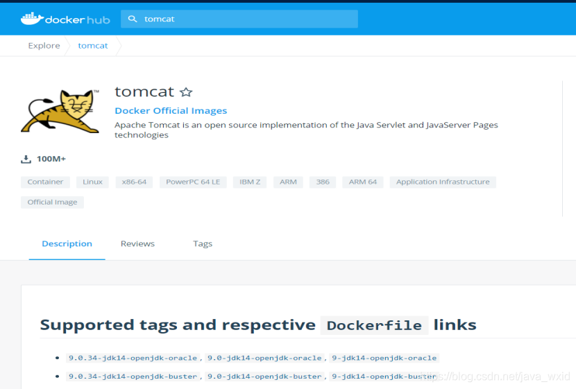 下载通过docker仓库远程下载所需要的版本的Tomcat镜像.该演示版本为Tomcat8.具体所需版本如下图1登录docker仓库官网查看.图二为所有可以远程下载的tomcat版本,根据需要的版本加版本号下载.