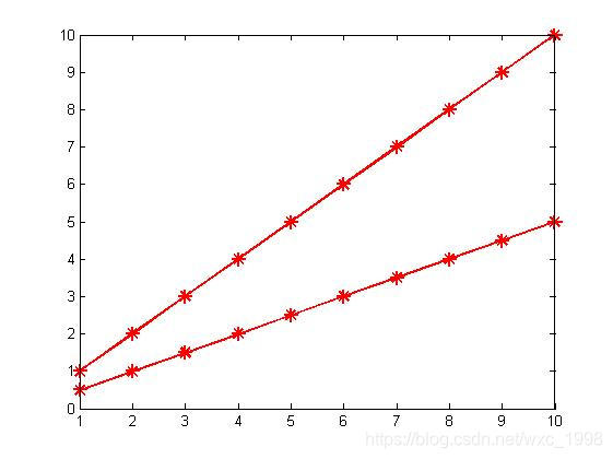 X1 = 1: 1: 10; Y1 = 1: 1: 10; X2 = 1: 1: 10; Y2 = 0.5: 0.5: 5; plot(X1, Y1, '-r','Marker', '*', 'LineWidth', 1.5, 'MarkerSize', 10); hold on; plot(X2, Y2, '-r','Marker', '*', 'LineWidth', 1.5, 'MarkerSize', 10);