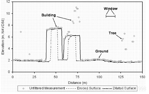 Kilian等人提出,可以在“开操作”处理后的结果中的每一个“窗口”内找到一个“最低点”,然后此窗口内的其他点若落在“最低点”的一个高程范围内则认为是地面点。这个高程范围通常根据机载LiDAR系统扫描的精度来定义,正常为20-30cm。