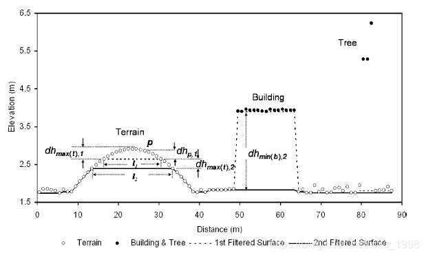 在第二次迭代中假设上一次滤波表面和本次滤波表面的最大高程差为dhmax(t),2,则如果dhmax(t),2 < dhT,2,则高程差值在dhmax(t),2范围内的地面点都会被保留。类似的,假设在上次迭代和本次迭代之间建筑高程差值最小为dhmin(b),2(通常近似为建筑的高度),如果dhmin(b),2 > dhT,2,则建筑就会被移除。