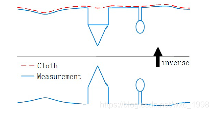 下方的蓝色图形代表原始测量值,对其进行翻转,红色虚线代表布料,可以反映地形的起伏。