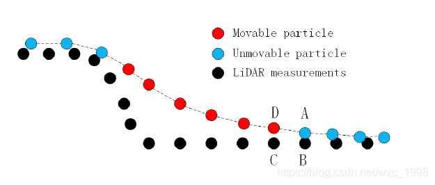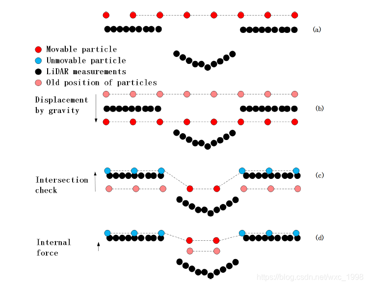 (a)为初始状态,假设一个虚拟的布放在翻转的LiDAR测量值上方。黑色点为LiDAR测量值,深红色点为可移动粒子。