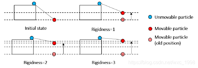 随后如下图所示,通过四个状态对“布料”粒子的移动过程进行说明。