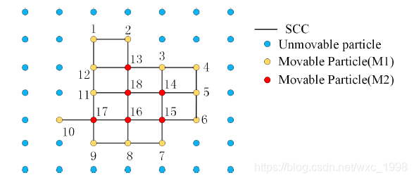 如上图所示,每个SCC中包括两种粒子,第一种是至少包含一个近邻“不可移动”粒子(上图中的黄色点M1),第二种是近邻点中不包含“不可移动”粒子(上图中的红色点M2)。执行过程中使用外部的黄色点为“初始种子点”,通过“广度优先”的方式逐步向内遍历SCC。如上图中的从1-18点,实现了从边缘逐步向内部靠近处理过程,而不受扫描方向的影响。