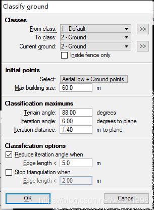 - Classify --> Routine -->Ground进行滤波,分离出地面点。TSCAN中使用的算法为PTD(渐进三角网加密)想了解的同学可以参考这里。我们这里就不对其参数进行过多的解释了。