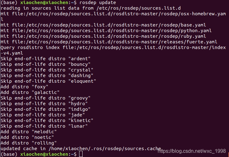 修改后接着使用rosdep update命令进行更新,若出现time out的错误,还是因为访问外网的速度太慢或不能访问。