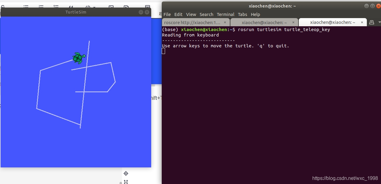 把鼠标放在第三个终端界面上,能够键盘上的上下左右进行控制小海龟的移动,轨迹如下。