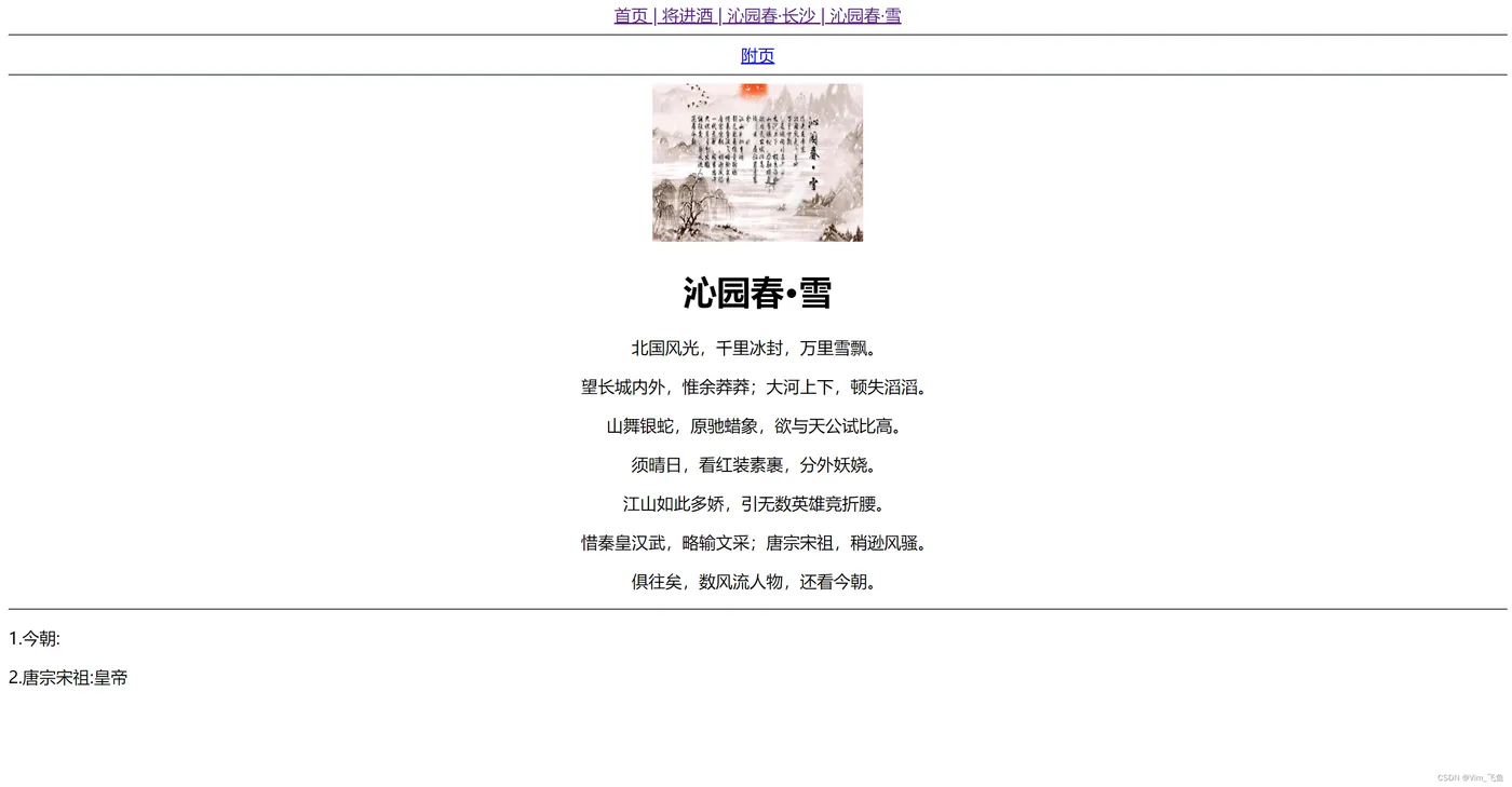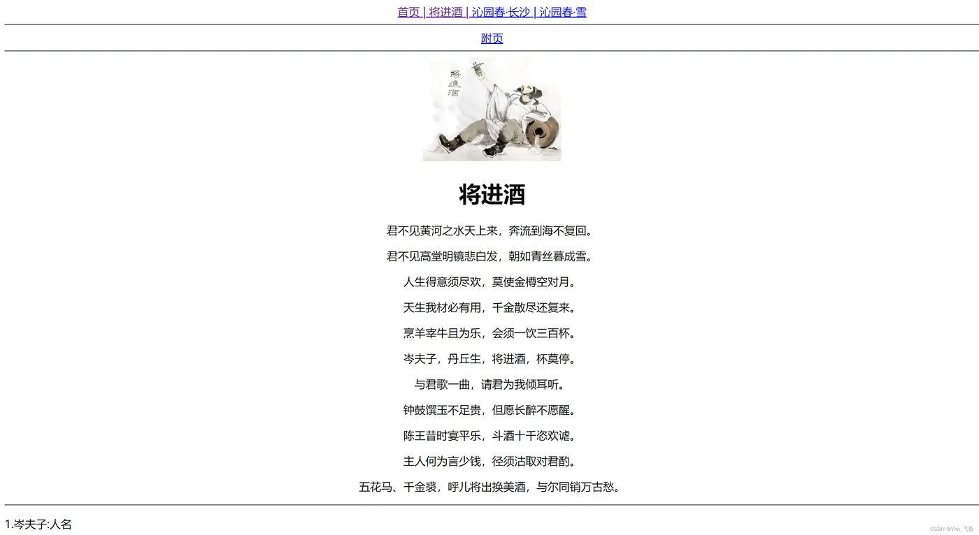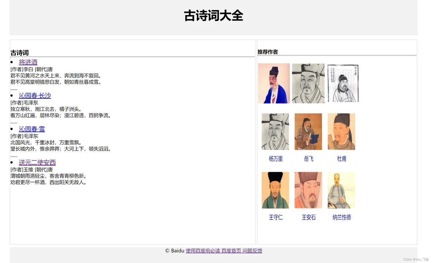 <!DOCTYPE html> <html lang="en"> <head> <meta charset="utf-8"> <meta content="width=device-width, initial-scale=1.0" name="viewport"> <title> 古诗词大全 </title> <link href="./style.css" rel="stylesheet" type="text/css"> </link> </meta> </meta> </head> <body> <div id="con"> <div id="a"> <h3> 古诗词大全 </h3> </div> <div id="b"> <div id="d"> <br/> <h5> 推荐作者 <br/> <hr/> <br/> </h5> <div> <img alt="刘禹锡" height="100px" position="absolute" src="images/刘禹锡.jpg" width="80px"/> <img alt="杨万里" height="100px" position="absolute" src="images/杨万里.jpg" width="80px"/> <img alt="柳宗元" height="100px" position="absolute" src="images/柳宗元.jpg" width="80px"/> </div> <div> <img alt="" height="300" src="images/shiren.jpg" width="250"> </img> </div> </div> <div id="f"> <br/> <h4> 古诗词 </h4> <hr/> <li> <a href="first.html"> 将进酒 </a> <p> [作者]李白 [朝代]唐 <br/> 君不见黄河之水天上来,奔流到海不复回。 <br/> 君不见高堂明镜悲白发,朝如青丝暮成雪。 <br/> ...... <br/> </p> </li> <li> <a href="second.html"> 沁园春·长沙 </a> <p> [作者]毛泽东 <br/> 独立寒秋,湘江北去,橘子洲头。 <br/> 看万山红遍,层林尽染;漫江碧透,百舸争流。 <br/> ...... <br/> </p> </li> <li> <a href="thired.html"> 沁园春·雪 </a> <p> [作者]毛泽东 <br/> 北国风光,千里冰封,万里雪飘。 <br/> 望长城内外,惟余莽莽;大河上下,顿失滔滔。 <br/> ...... <br/> </p> </li> <li> <a href=""> 送元二使安西 </a> <p> [作者]王维 [朝代]唐 <br/> 渭城朝雨浥轻尘,客舍青青柳色新。 <br/> 劝君更尽一杯酒,西出阳关无故人。 <br/> </p> </li> </div> </div> <div id="c"> <p id="copyright"> © Baidu <a href="http://www.baidu.com/duty/"> 使用百度前必读 </a> <a href="http://www.baidu.com"> 百度首页 </a> <a href="/s" style="display:none"> 站内搜索 </a> <a href="http://help.baidu.com/newadd?prod_id=8&category=1"> 问题反馈 </a> </p> </div> </div> </body> </html>