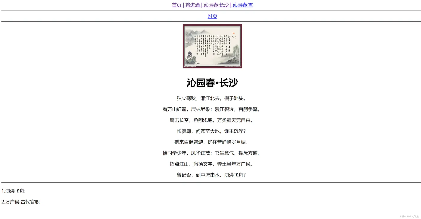 <!DOCTYPE html> <html lang="en"> <head> <meta charset="utf-8"> <meta content="width=device-width, initial-scale=1.0" name="viewport"> <title> Enovo沁园春·长沙 </title> </meta> </meta> <style typr="text/css"> hr{ background-color: #303841; border: none; height: 1px; width: 100%; } p{ font-family: 楷书; } </style> </head> <body> <div align="center" id="container"> <div id="navi"> <a href="index.html"> 首页 | </a> <a href="first.html"> 将进酒 | </a> <a href="second.html"> 沁园春·长沙 | </a> <a href="thired.html"> 沁园春·雪 </a> <hr/> <a href="oddments.html"> 附页 </a> </div> <hr/> <img alt="" height="150px" src="images/chang.jpg" width="200px"> <div id="contain"> <h1> 沁园春·长沙 </h1> <p> 独立寒秋,湘江北去,橘子洲头。 </p> <p> 看万山红遍,层林尽染;漫江碧透,百舸争流。 </p> <p> 鹰击长空,鱼翔浅底,万类霜天竞自由。 </p> <p> 怅寥廓,问苍茫大地,谁主沉浮? </p> <p> 携来百侣曾游,忆往昔峥嵘岁月稠。 </p> <p> 恰同学少年,风华正茂;书生意气,挥斥方遒。 </p> <p> 指点江山,激扬文字,粪土当年万户侯。 </p> <p> 曾记否,到中流击水,浪遏飞舟? </p> </div> </img> </div> <hr/> <div class="exp"> <p> 1.浪遏飞舟: </p> <p> 2.万户侯:古代官职 </p> </div> </body> </html>