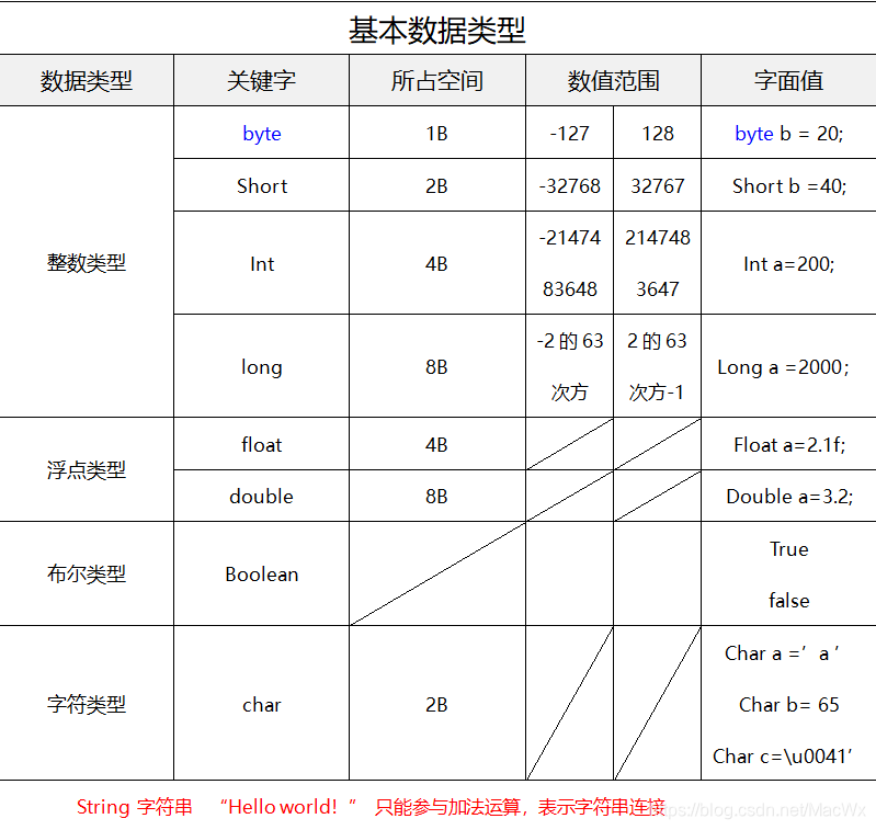 a)整数 名称 字节数 二进制表示 十进制表示 byte 1B -2^7--2^7-1 -128--127 short 2B -2^15--2^15-1 -32768--32767 int 4B -2^31--2^31-1 -2147483648--2147483647 long 8B -2^63--2^63-1 -9223372036854775808--9223372036854775807 注:long类型的值定义时需要在值后加L b)浮点数(小数,以科学计数法进行存储) 名称 字节数 float 4B 单精度浮点数 double 8B(默认) 双精度浮点数 注:float类型的值定义时需要在值后加F eg:2.2E9=2.2*10^9 c)字符 char 2B 无负数 0--65535 Unicode(万国码) Unicode支持ASCII eg: char c1='A';保存字符A char c2=65;对应Unicode表寻找65 代表的字符,保存在c2 char c3='\u0041';在Unicode表中寻找十六进制41对应十进制65的值,保存在c3 大小写相差32 d)布尔 boolean true/false 2)引用数据类型 String :字符串 eg:String s="HelloWorld";