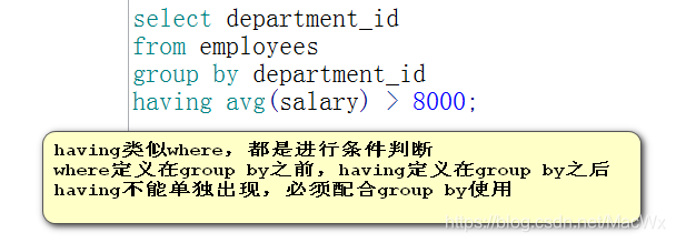 1,分组后的数据,以组为单位进行操作,所以后select可以跟组函数