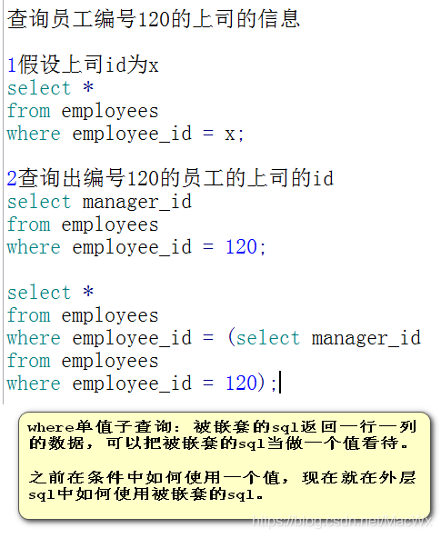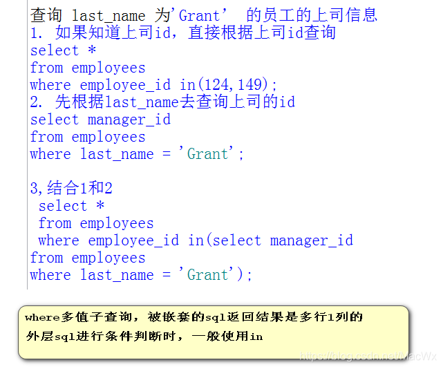 被嵌套的SQL返回一行一列的结果。 - where多值子查询:被嵌套的SQL返回结果是多行一列的数据。