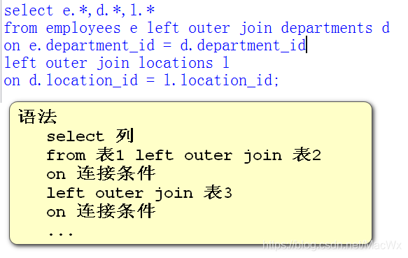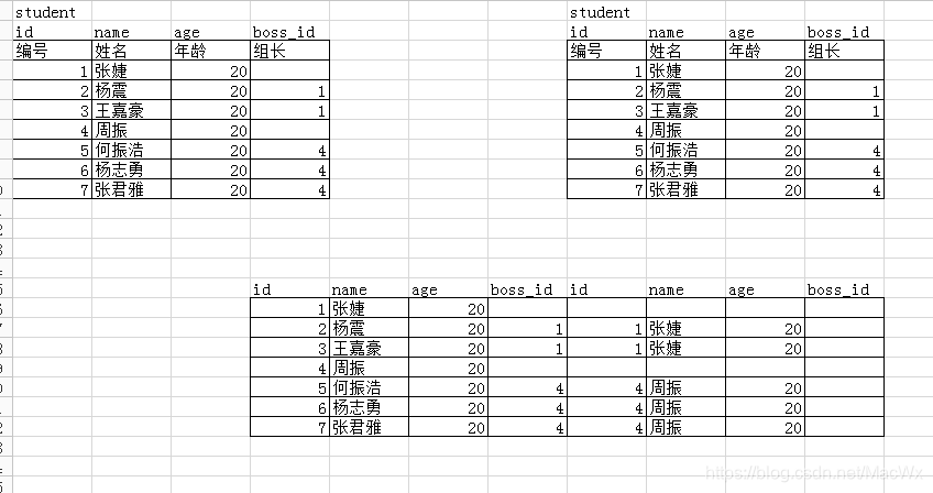 Sql: Select s1.name,s2.name From student s1 left join student s2 On s1.boss_id = s2.id 统计每个员工的姓名和领导的姓名。 Sql: Select e1.first_name,e1.last_name,e2.first_name,e2.last_name From employees e1 left join employees e2 On e1.manager_id=e2.employee_id
