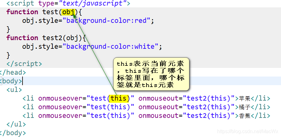 this表示当前元素,this写在了哪个标签里面,哪个标签就是this元素。