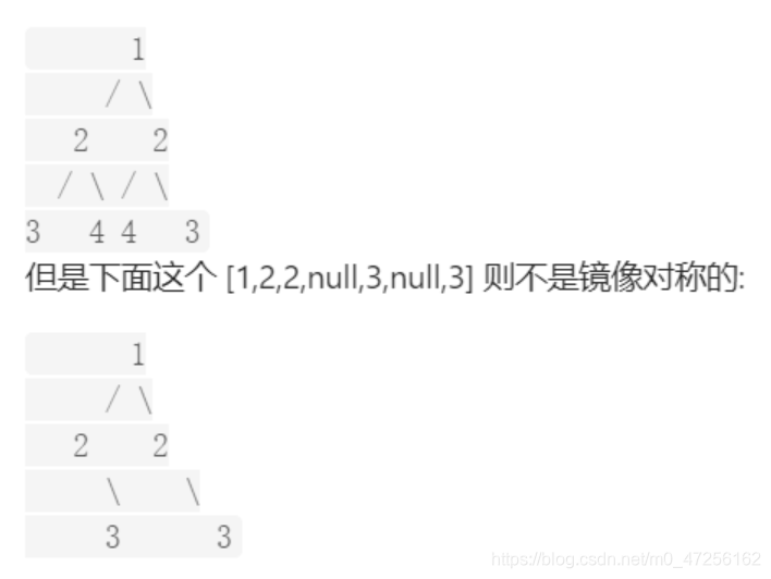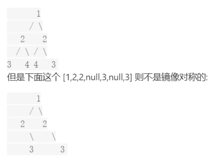 示例 1: 输入:root = [1,2,2,3,4,4,3] 输出:true 示例 2: 输入:root = [1,2,2,null,3,null,3] 输出:false