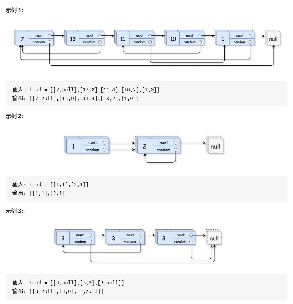 请实现 copyRandomList 函数,复制一个复杂链表。 在复杂链表中,每个节点除了有一个 next 指针指向下一个节点, 还有一个 random 指针指向链表中的任意节点或者 null。