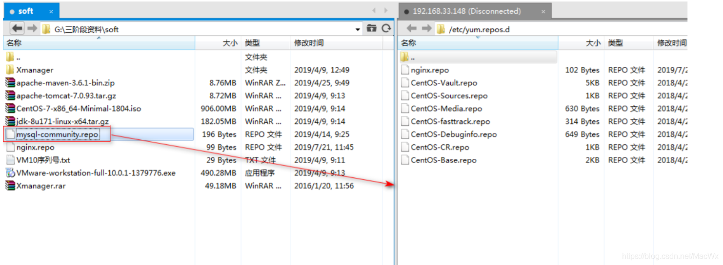 如果不上传yum源 ,centos它是找不到mysql的安装镜像的,所以我们需要给他一个源镜像,放在/etc/yum.repos.d文件夹下