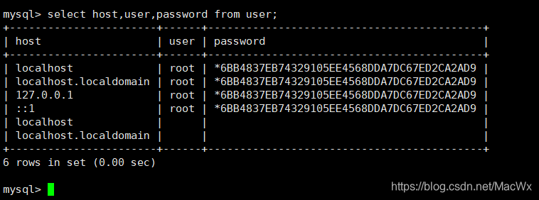 可以再通过select host,user,password from user;语句查看一下: