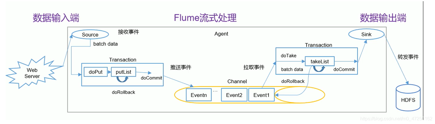 在整个Flume采集数据的过程中,内部发生了很多的事务,在Source阶段有一个Put事务,在sink阶段有一个Take阶段,他们的任务分别是推送时间和拉取事件。