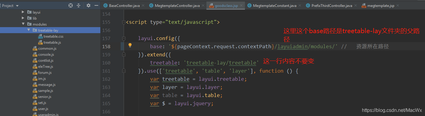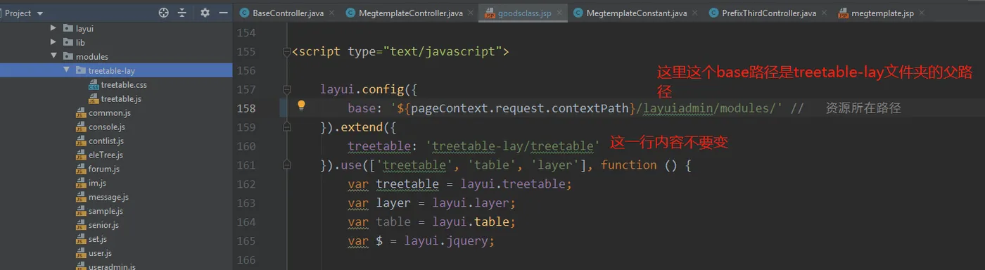 要扩展layui的模块使用我们引入的js模块,注意base路径是treetable-lay文件夹所在的父路径,这里出错会报404,extend内容最好不要改。