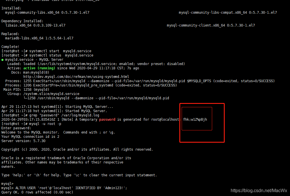 此时MySQL已经开始正常运行,不过要想进入MySQL还得先找出此时root用户的密码,通过如下命令可以在日志文件中找出密码: