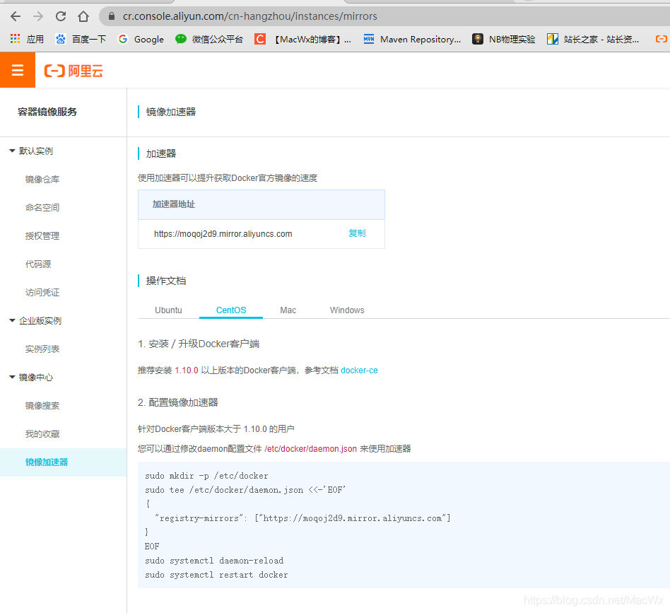 打开阿里云控制台的容器镜像服务,找到镜像加速器