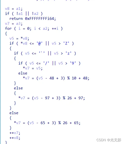 *v7 = (v5 - 48 + 3) % 10 + 48;这是典型的凯撒加密的特征
