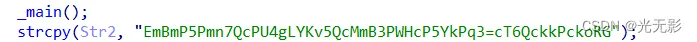 int __cdecl main(int argc, const char **argv, const char **envp) { int v3; // eax int v4; // eax int v5; // eax int result; // eax char Str; // [rsp+20h] [rbp-60h] char Str1; // [rsp+50h] [rbp-30h] char v9; // [rsp+90h] [rbp+10h] char v10; // [rsp+D0h] [rbp+50h] char Str2[8]; // [rsp+110h] [rbp+90h] int v12; // [rsp+14Ch] [rbp+CCh] _main(); strcpy(Str2, "EmBmP5Pmn7QcPU4gLYKv5QcMmB3PWHcP5YkPq3=cT6QckkPckoRG"); puts("Hello, please input your flag and I will tell you whether it is right or not."); scanf("%38s", &Str); if ( strlen(&Str) == 38 && (v3 = strlen(&Str), (unsigned int)encode_one(&Str, v3, &v10, &v12) == 0) && (v4 = strlen(&v10), (unsigned int)encode_two(&v10, v4, &v9, &v12) == 0) && (v5 = strlen(&v9), (unsigned int)encode_three(&v9, v5, &Str1, &v12) == 0) && !strcmp(&Str1, Str2) ) { puts("you are right!"); result = 0; } else { printf("Something wrong. Keep going."); result = 0; } return result; }
