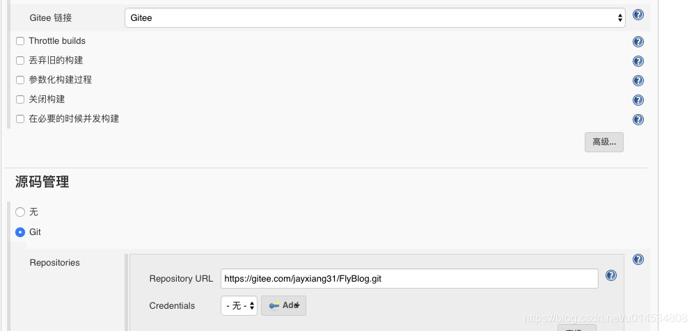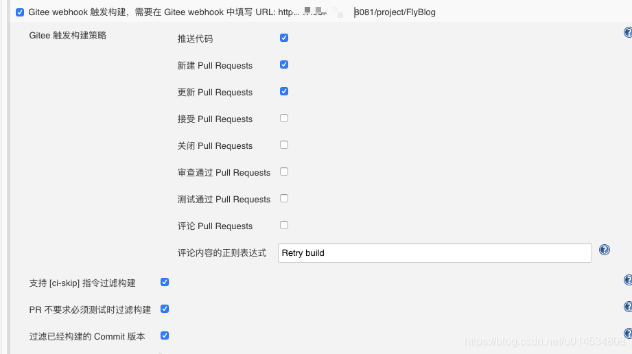 触发器也配置好 之后,我们就需要在对应的码云上的仓库上配置WebHooks,前面在jenkins 上给出的地址是http://你的ip:8081/project/FlyBlog但是我的Jenkins的端口是8082,遂改成了 8082端口。