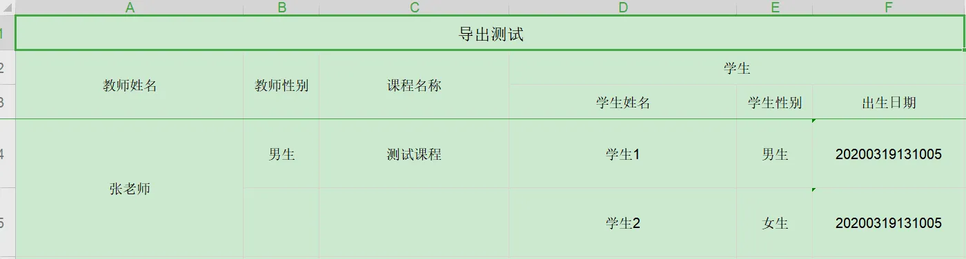 @ExcelTarget("courseEntity") public class CourseEntity implements java.io.Serializable { /** 主键 */ private String id; /** 课程名称 */ @Excel(name = "课程名称", orderNum = "1", width = 25,needMerge = true) private String name; /** 老师主键 */ //@ExcelEntity(id = "major") private TeacherEntity chineseTeacher; /** 老师主键 */ @ExcelEntity(id = "absent") private TeacherEntity mathTeacher; @ExcelCollection(name = "学生", orderNum = "4") private List<StudentEntity> students;
