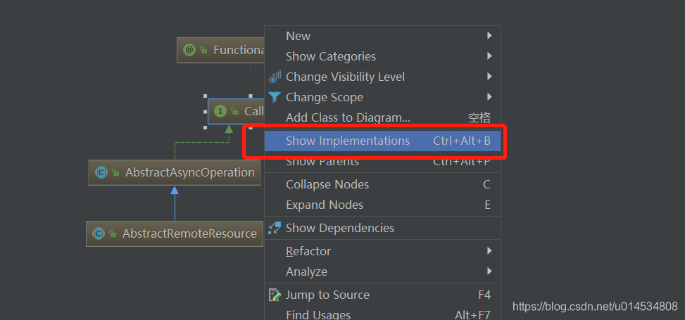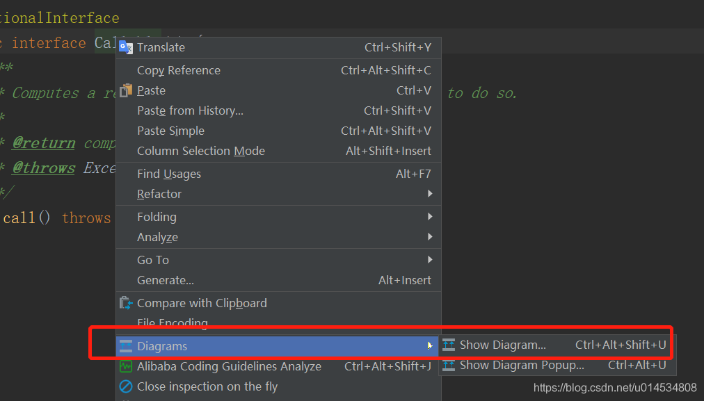 图表展示一个接口的所有实现类,以Callable接口为例,在接口上右键,选中 Diagrams—>Show Diagram 展示图表。