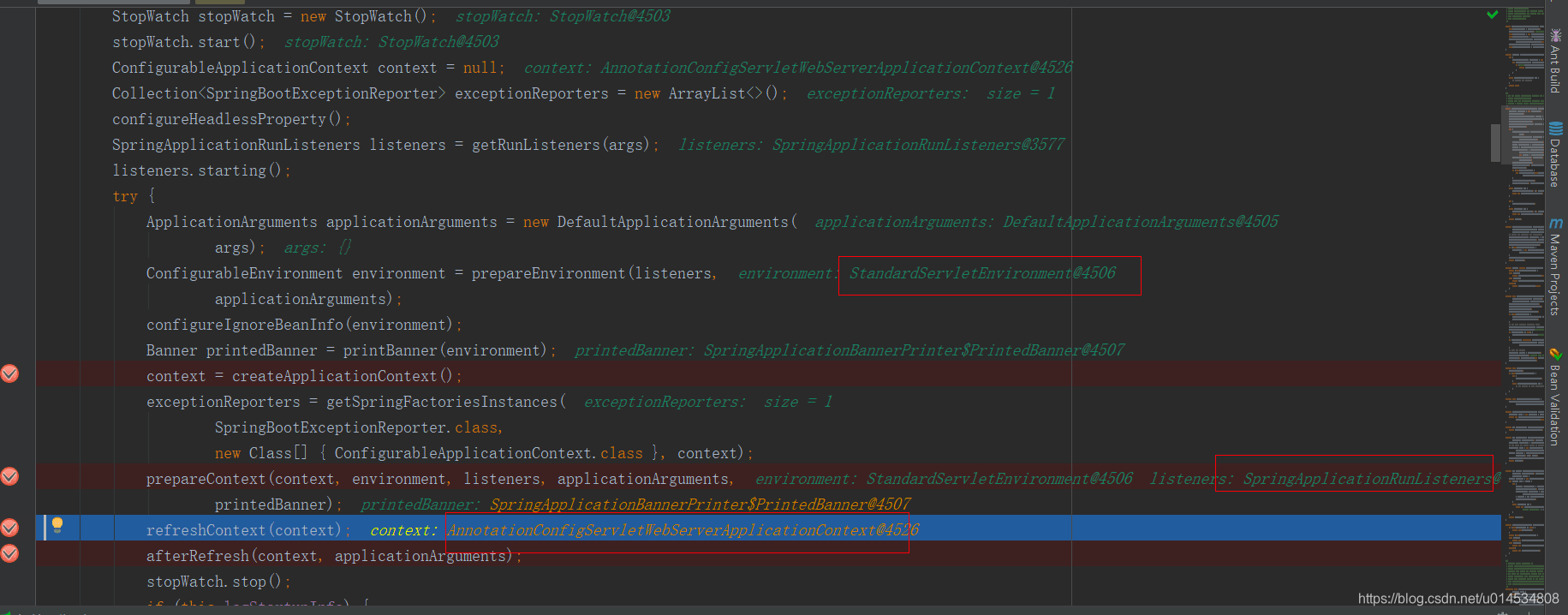 private void prepareContext(ConfigurableApplicationContext context, ConfigurableEnvironment environment, SpringApplicationRunListeners listeners, ApplicationArguments applicationArguments, Banner printedBanner) { //1. 将准备好的Environment设置给ApplicationContext context.setEnvironment(environment); postProcessApplicationContext(context); //2. 遍历调用所有的ApplicationContextInitializer的 initialize() 方法来对已经创建好的 ApplicationContext 进行进一步的处理。 applyInitializers(context); //3. 调用SpringApplicationRunListeners的 contextPrepared() 方法,通知所有的监听者,ApplicationContext已经准备完毕 listeners.contextPrepared(context); //4. 将applicationArguments实例注入到IOC容器 context.getBeanFactory().registerSingleton("springApplicationArguments", applicationArguments); if (printedBanner != null) { //5. 将printedBanner实例注入到IOC容器 context.getBeanFactory().registerSingleton("springBootBanner", printedBanner); } //6. 加载资源,这里的资源一般是启动类xxxApplication Set<Object> sources = getSources(); //7. 将所有的bean加载到容器中 load(context, sources.toArray(new Object[sources.size()])); //8. 调⽤SpringApplicationRunListener的 contextLoaded()⽅法,通知所有的监听者:ApplicationContext已经装载完毕 listeners.contextLoaded(context); }
