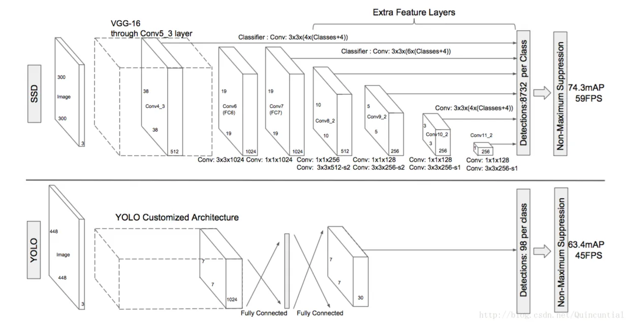图2:两个单次检测模型的比较:SSD和YOLO[5]。我们的SSD模型在基础网络的末端添加了几个特征层,它预测了不同尺度和长宽比的默认边界框的偏移量及其相关的置信度。300×300输入尺寸的SSD在VOC2007 test上的准确度上明显优于448×448的YOLO的准确度,同时也提高了速度。
